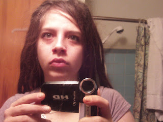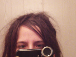 I've decided not to crochet until they've established themselves. So for right now I'm making sure the roots don't get too friendly with each other and doing a little palmrolling. That's it so far. I'm trying to not wash it until Saturday, but we'll see. I might have to because the itch is driving me nuts. It only itches in the morning and then I get used to it, but cheezus it's annoying. Oh and you'll notice I didn't dread some of the bangs. They are still long right now, but a friend is going to cut them so that they are at my jawbone and not in the way. :)